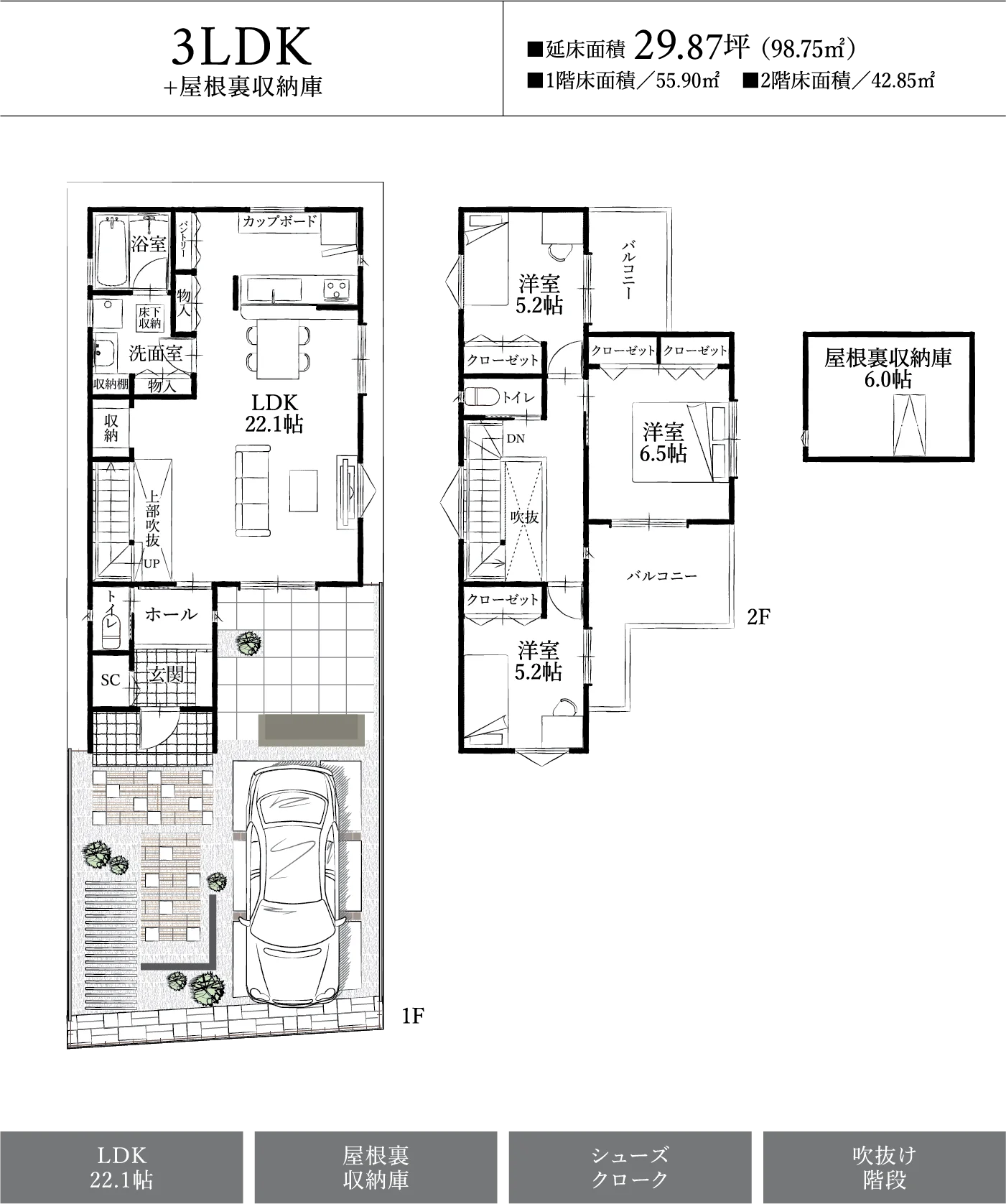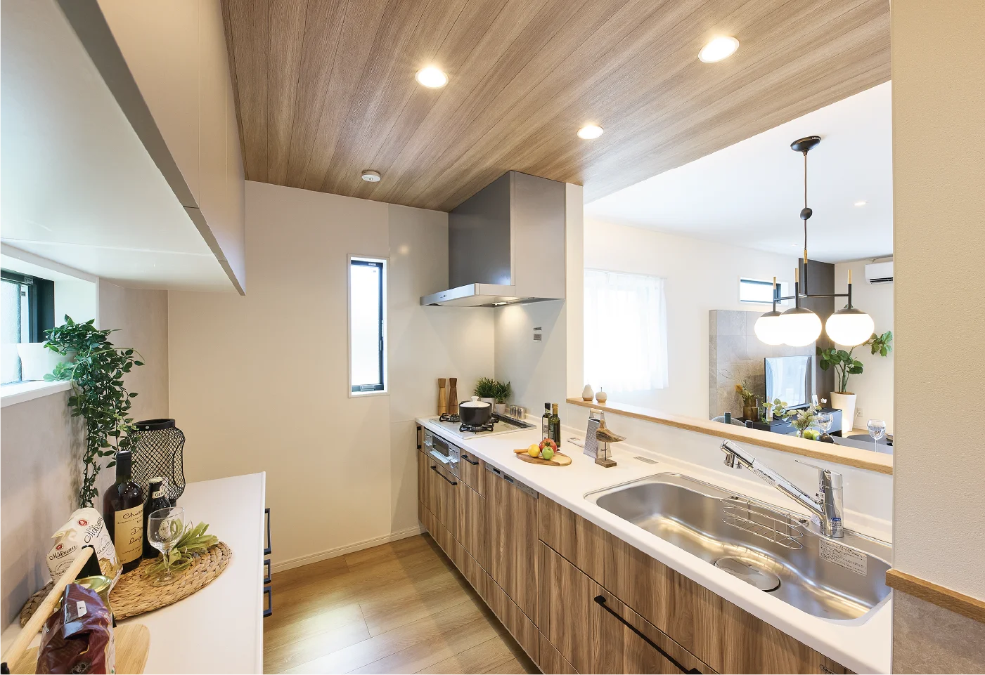リビングの吹抜け階段が上部からの光を採り入れ、明るく開放的なLDK。リビングと繋がるタイルテラスが空間の広がりを感じさせ、さらに開放感を演出しています。屋根裏収納庫やシューズクローク、パントリーなどの収納も充実しています。