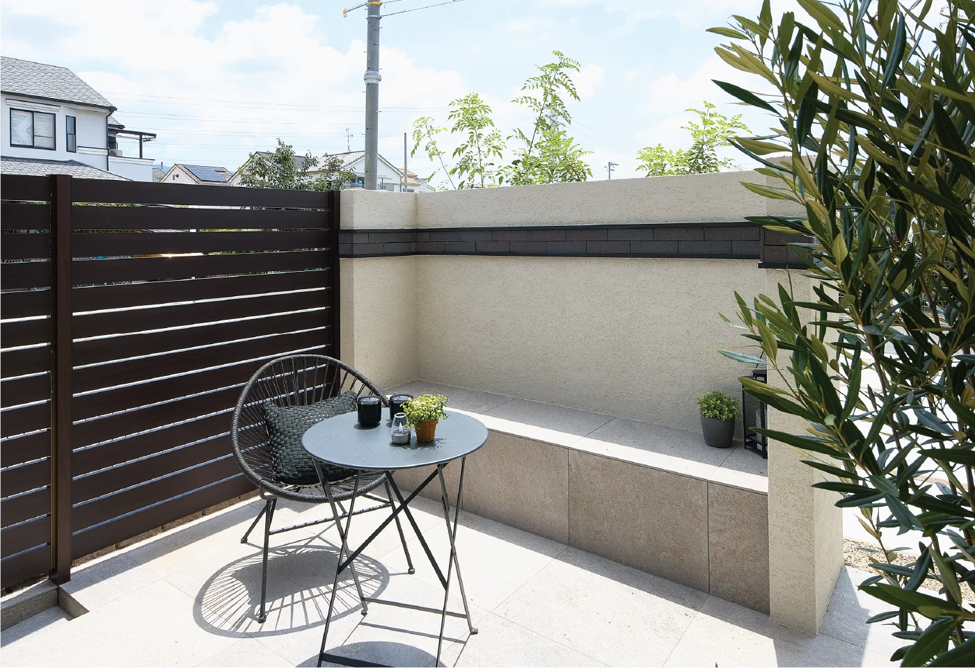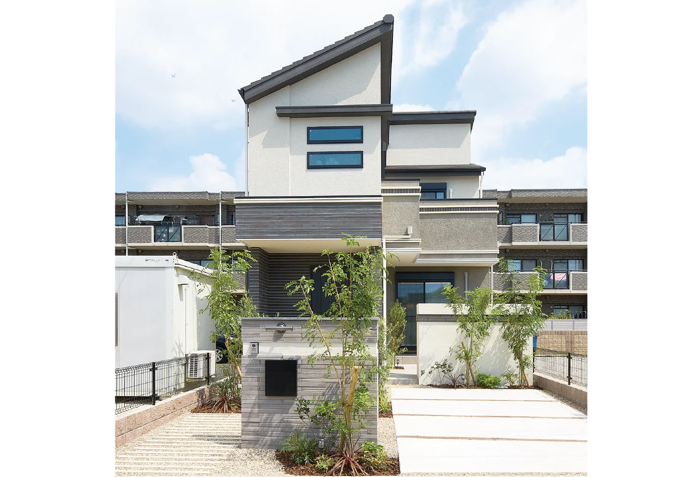 外からの視線を遮るクローズド外構を採用した落ち着きのある外観