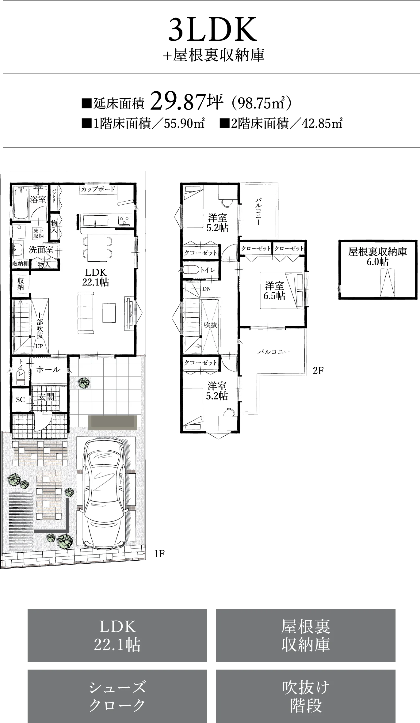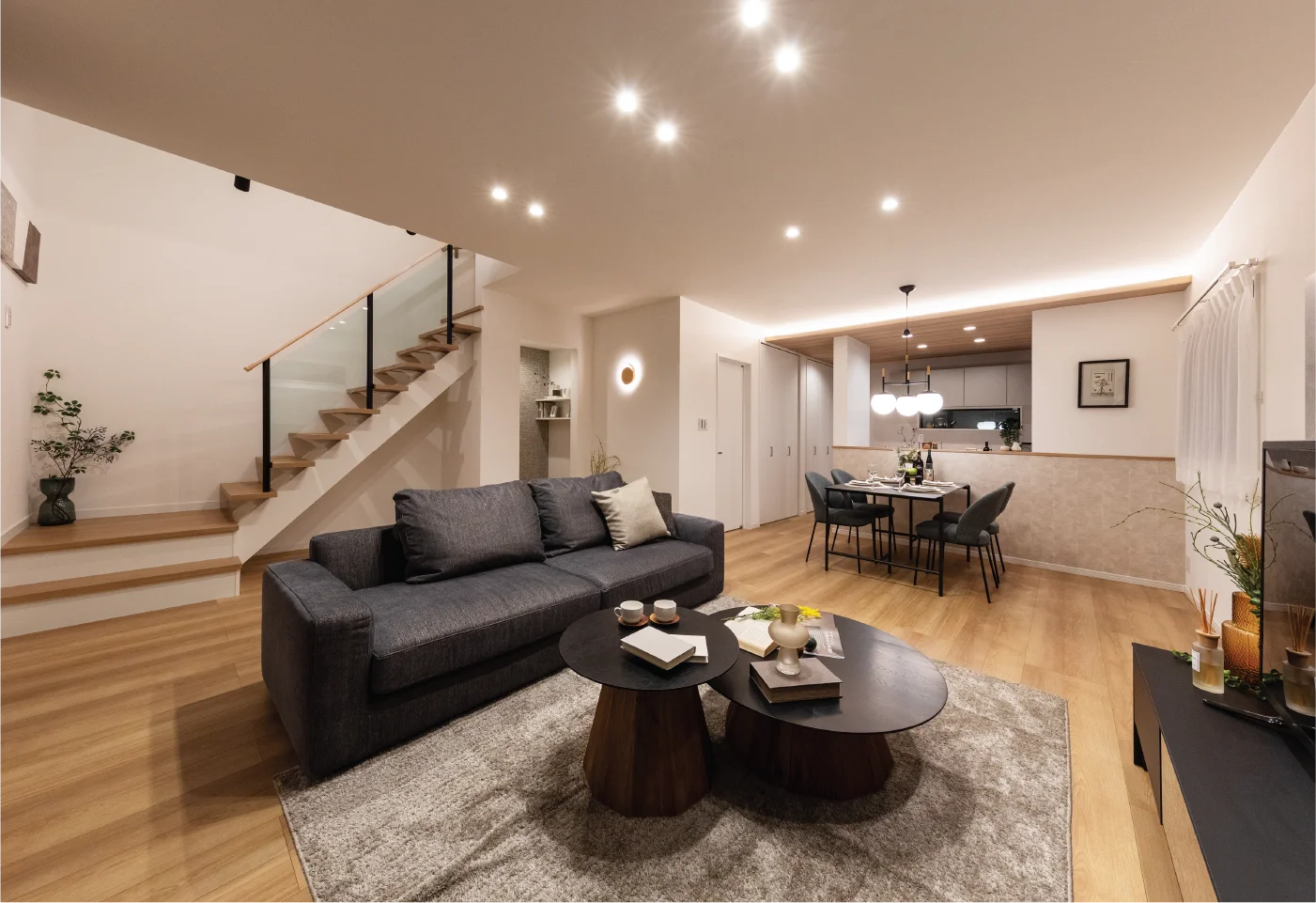 リビングの吹抜け階段が上部からの光を採り入れ、明るく開放的なLDK。リビングと繋がるタイルテラスが空間の広がりを感じさせ、さらに開放感を演出しています。屋根裏収納庫やシューズクローク、パントリーなどの収納も充実しています。